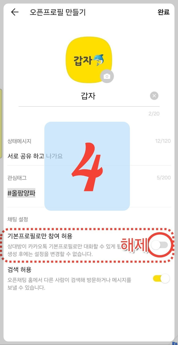 카카오톡 메인화면 → 상단 MY → 새 오픈 프로필만들기 → 기본프로필만참여 허용을 해제(중요) → 상단 완료 버튼→ 내 오픈톡방 주소 복사하기 → 원하는 카톡방에 링크 붙여 넣기 → 끝